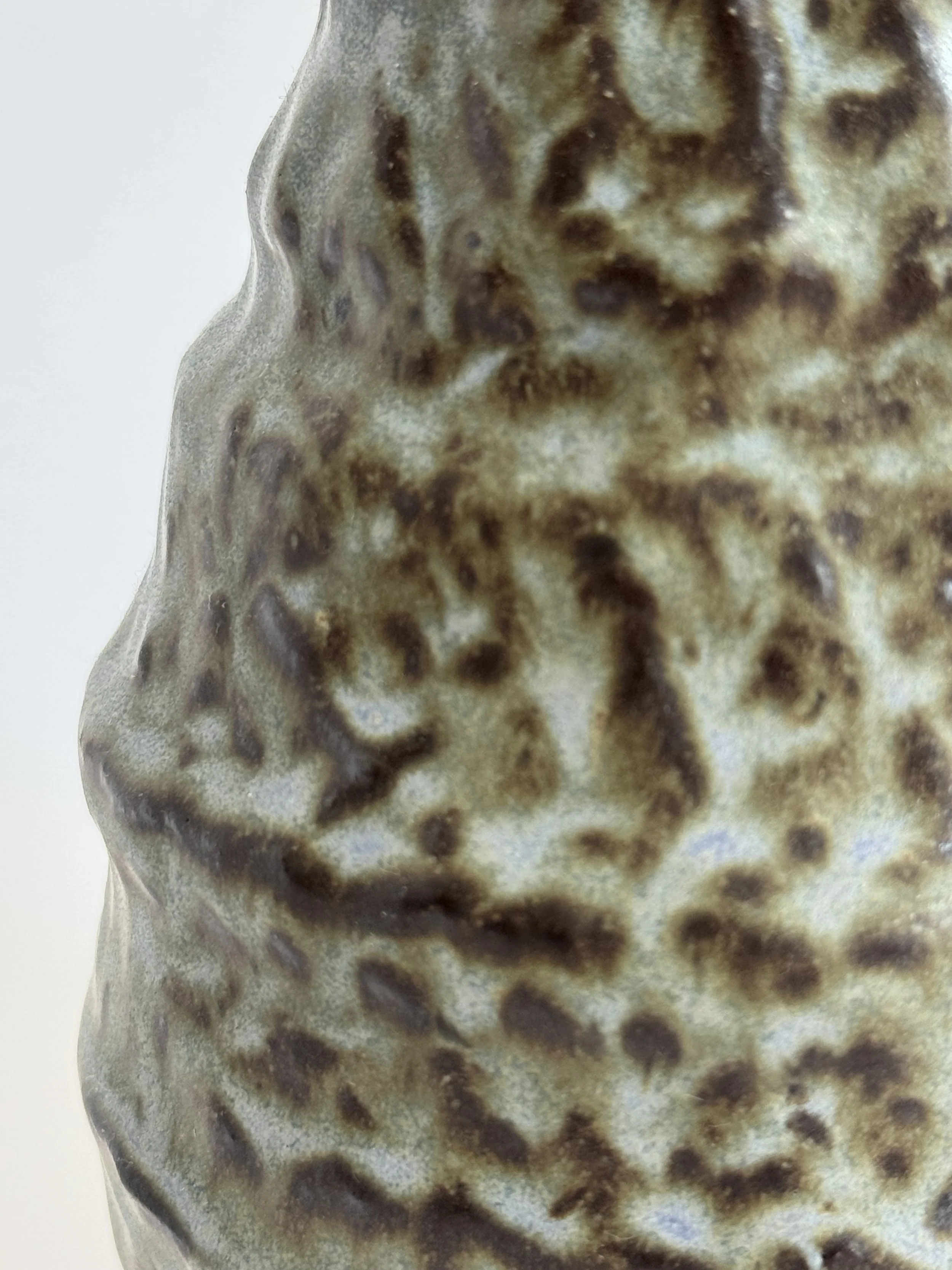 Thistle blue glaze pools in each finger divot, creating contrast with chocolate glaze over red clay.