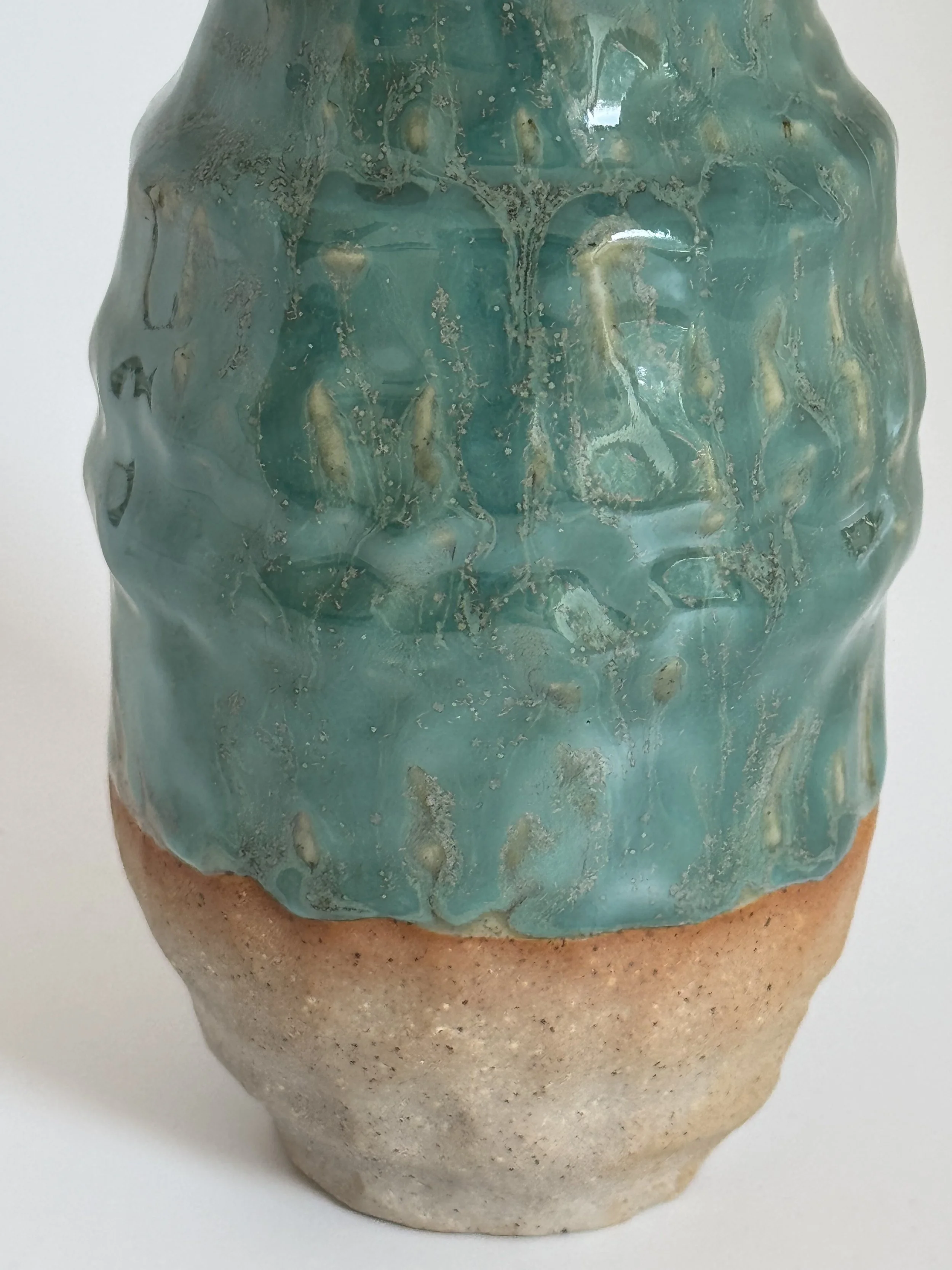 A sea glass glaze contrasts with orange flashing on white stoneware.