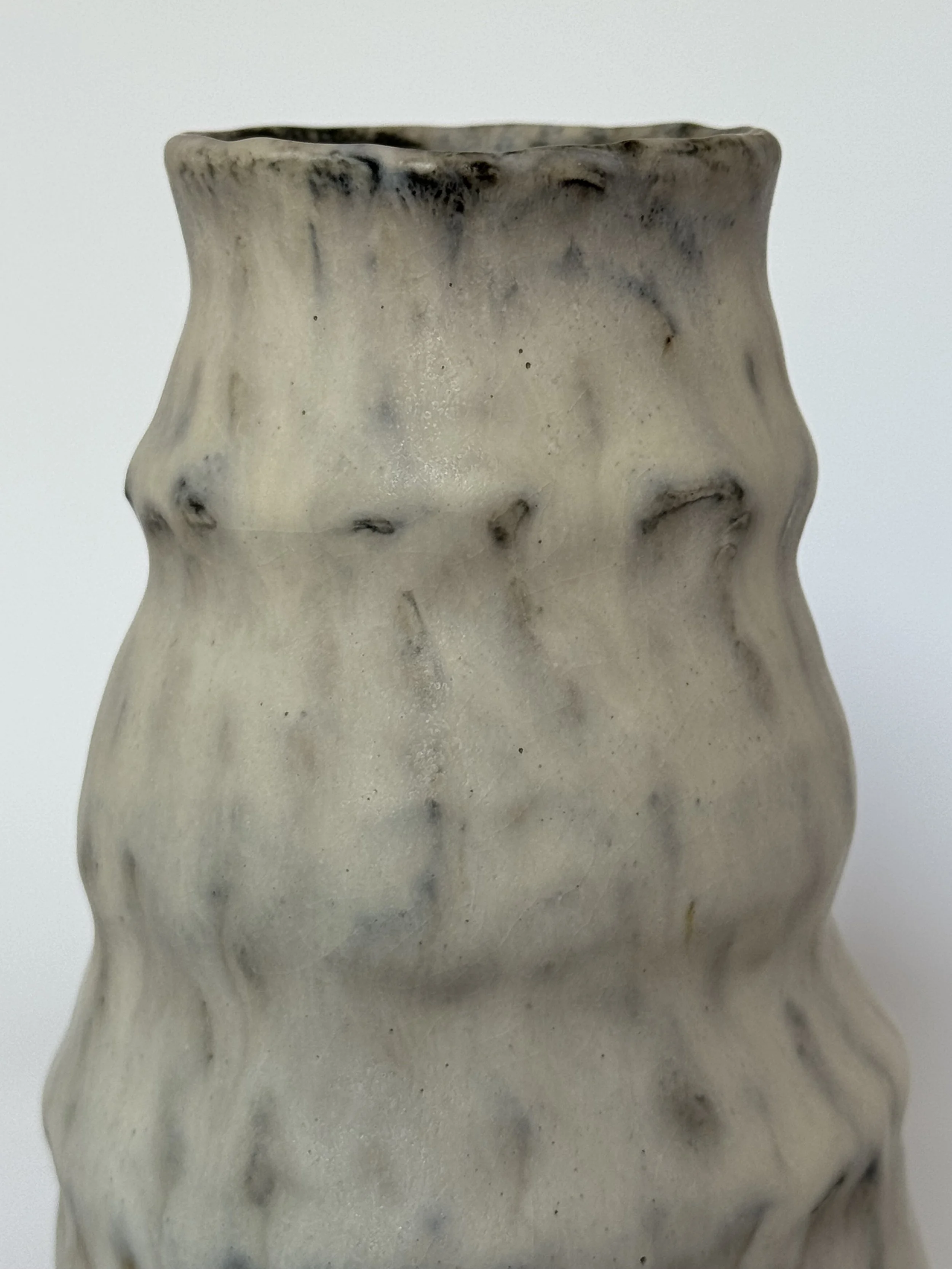 A creamy satin glaze coats soft waves. Pinched black slip peaks through, creating a subtle marbled surface.