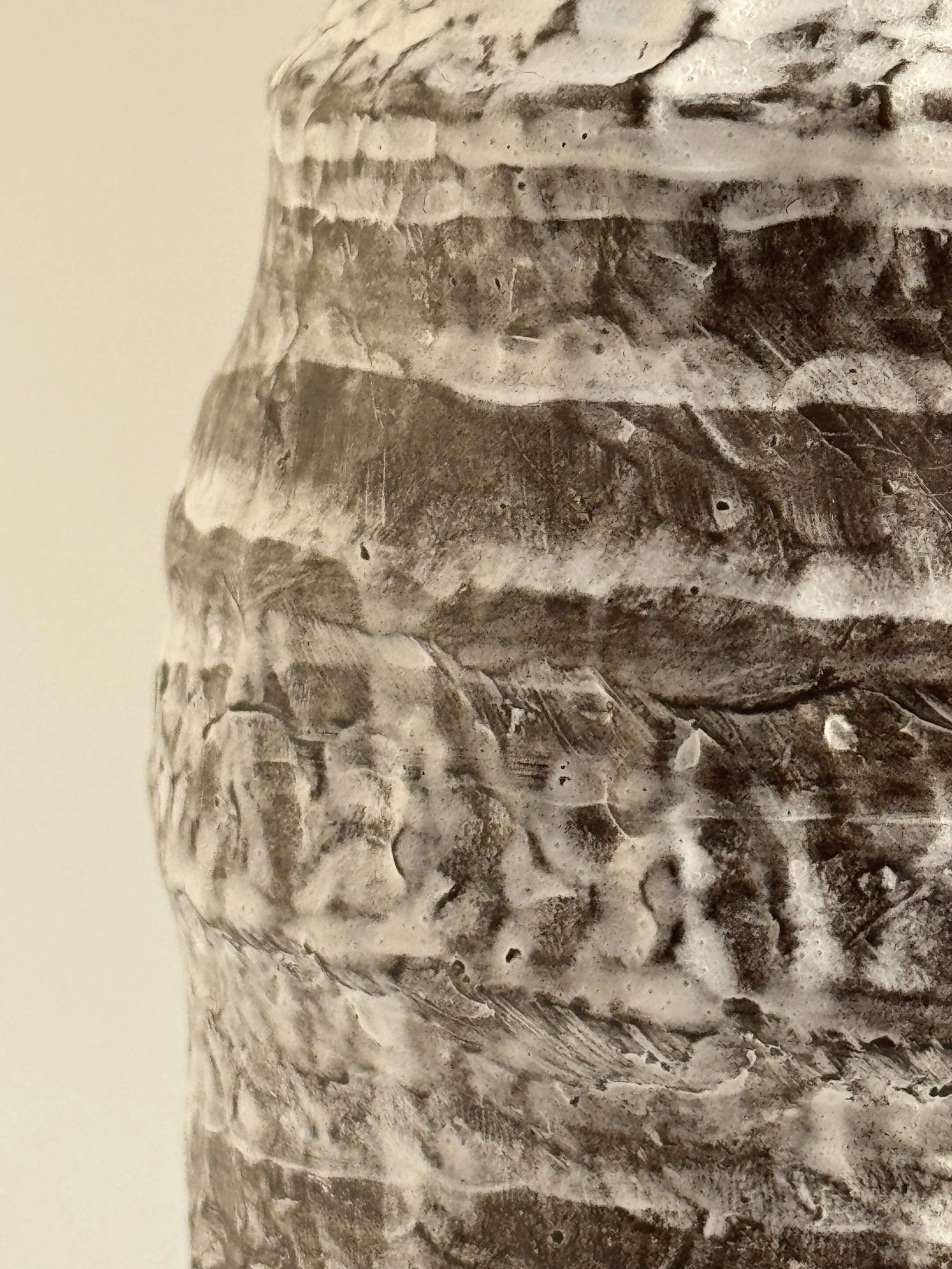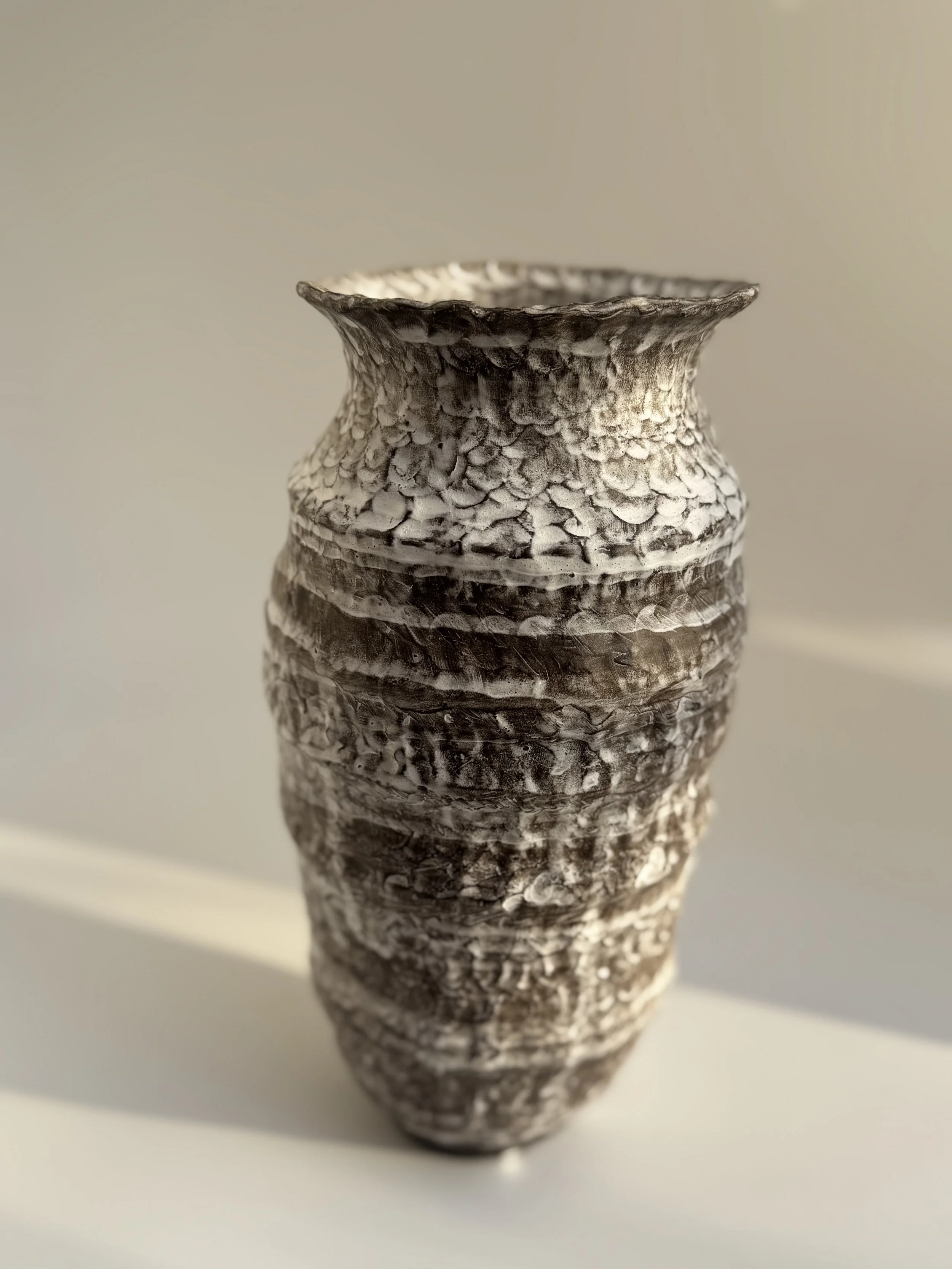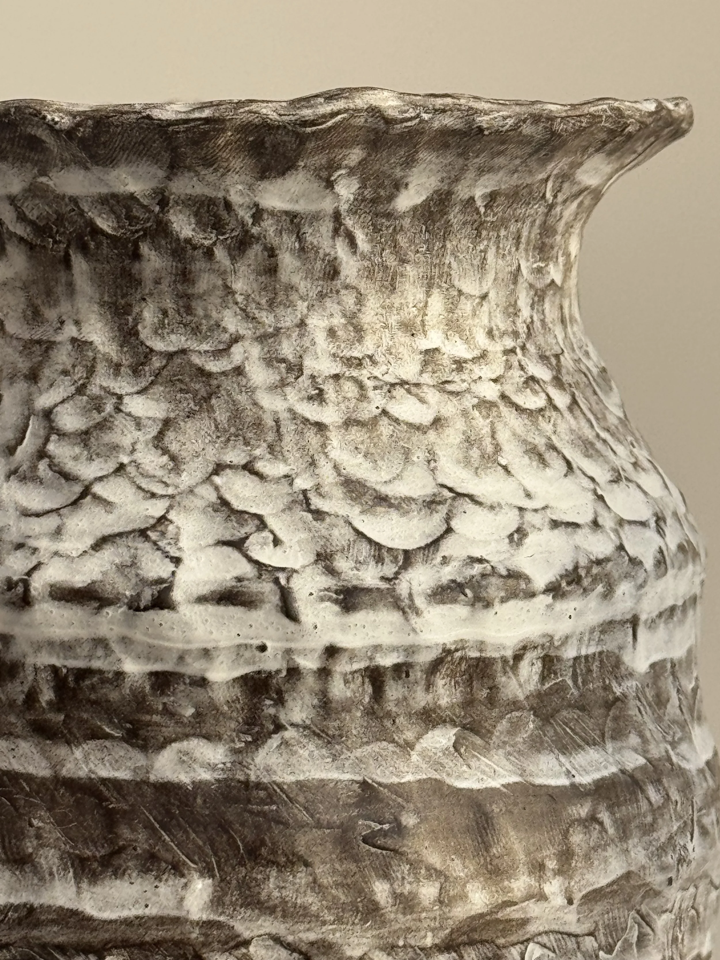 Thin layers of white terra sigillata are hand painted on the surface of dark brown clay, providing visual contrast and highlighting finger marks.