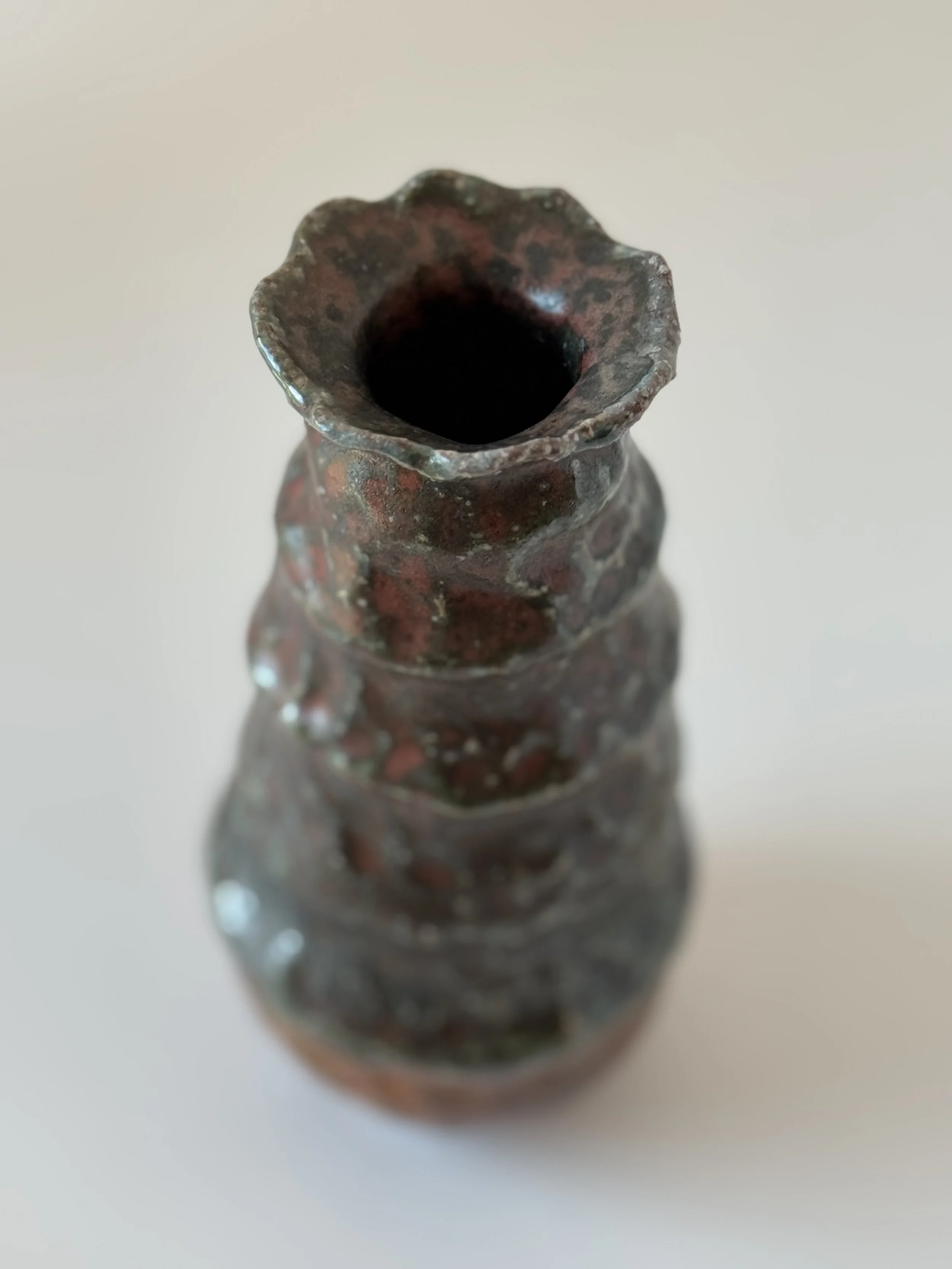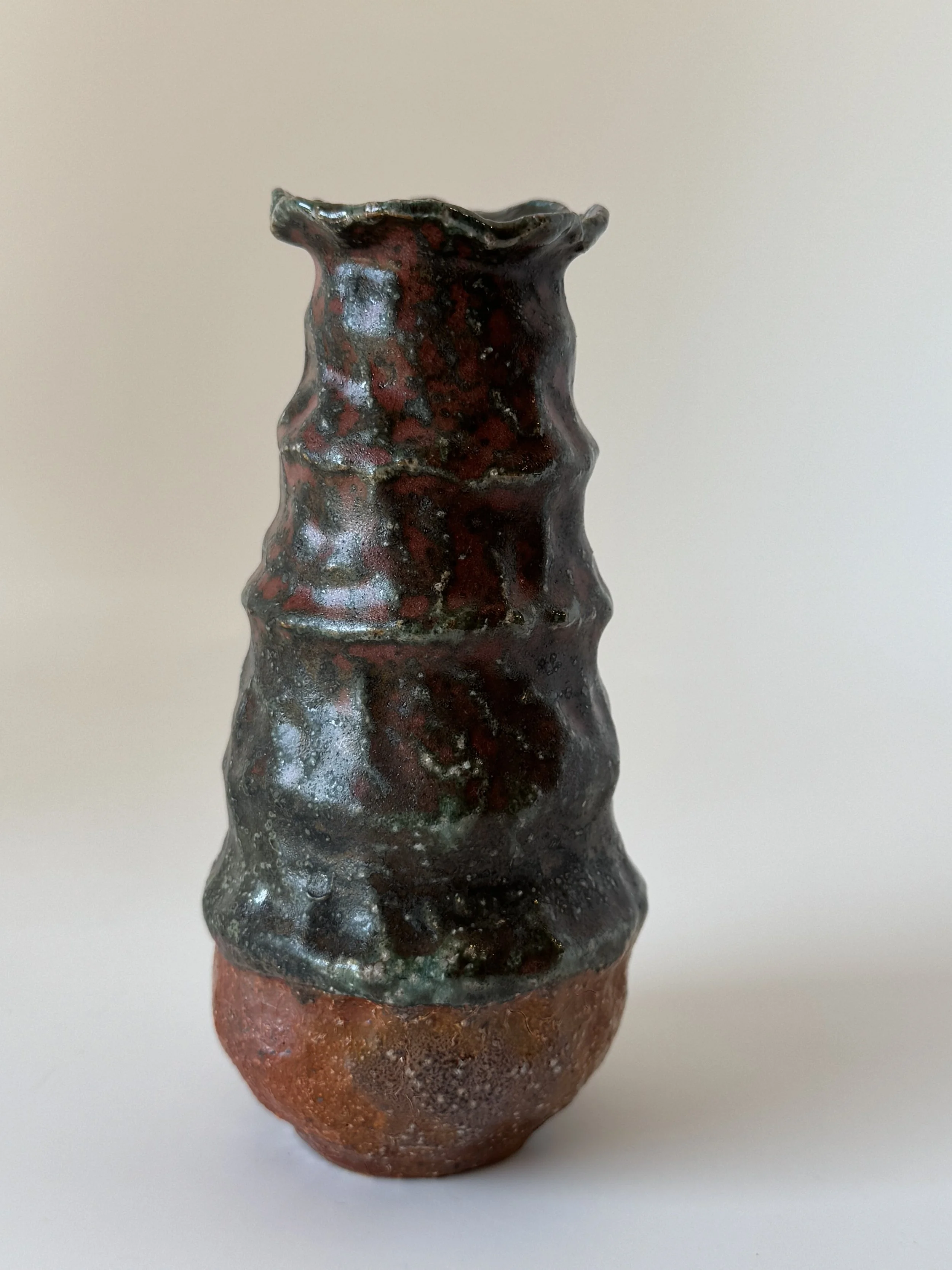 Soda fired to a toasty red and green with a contrasting flashing slip applied to the base.