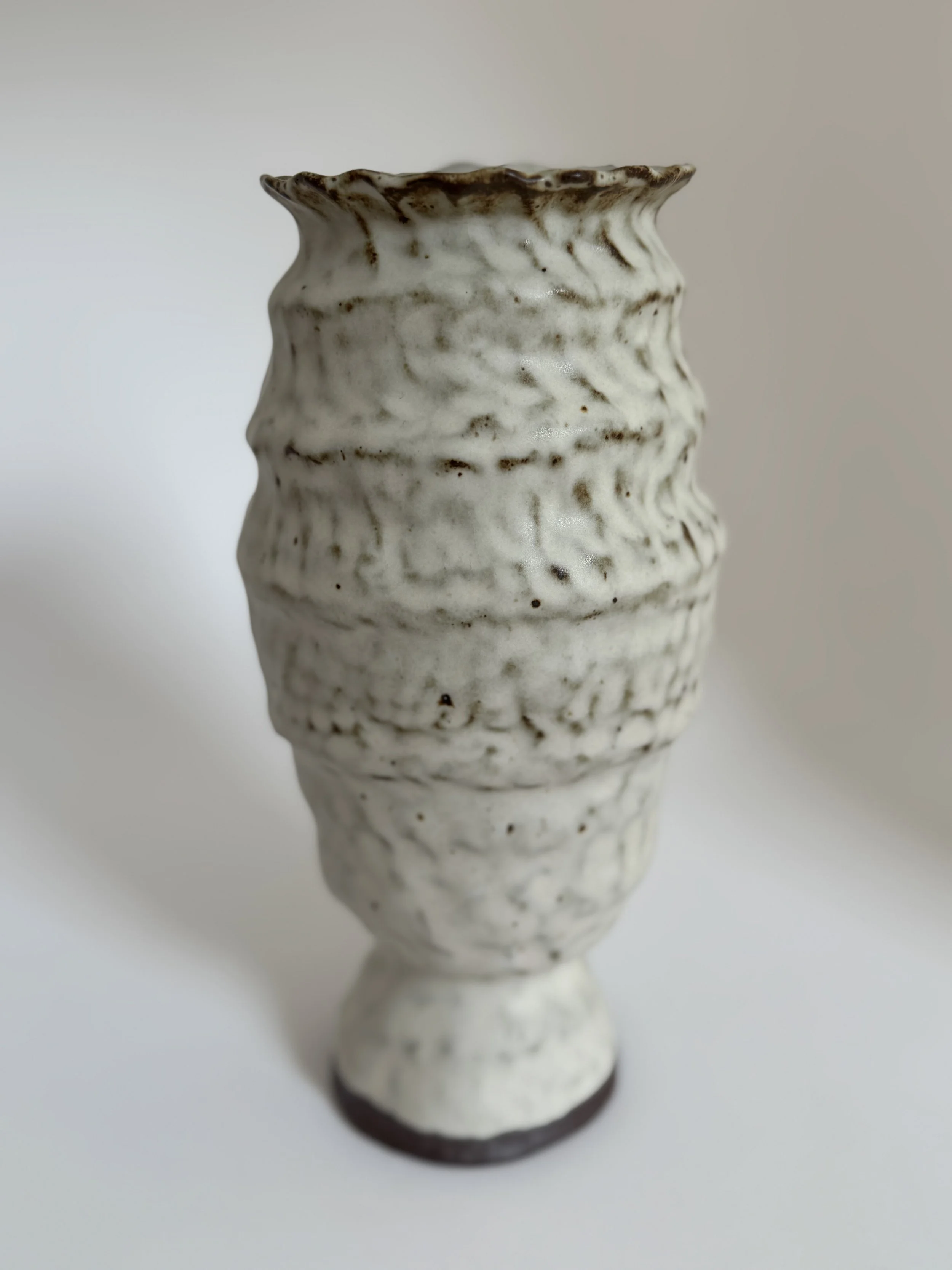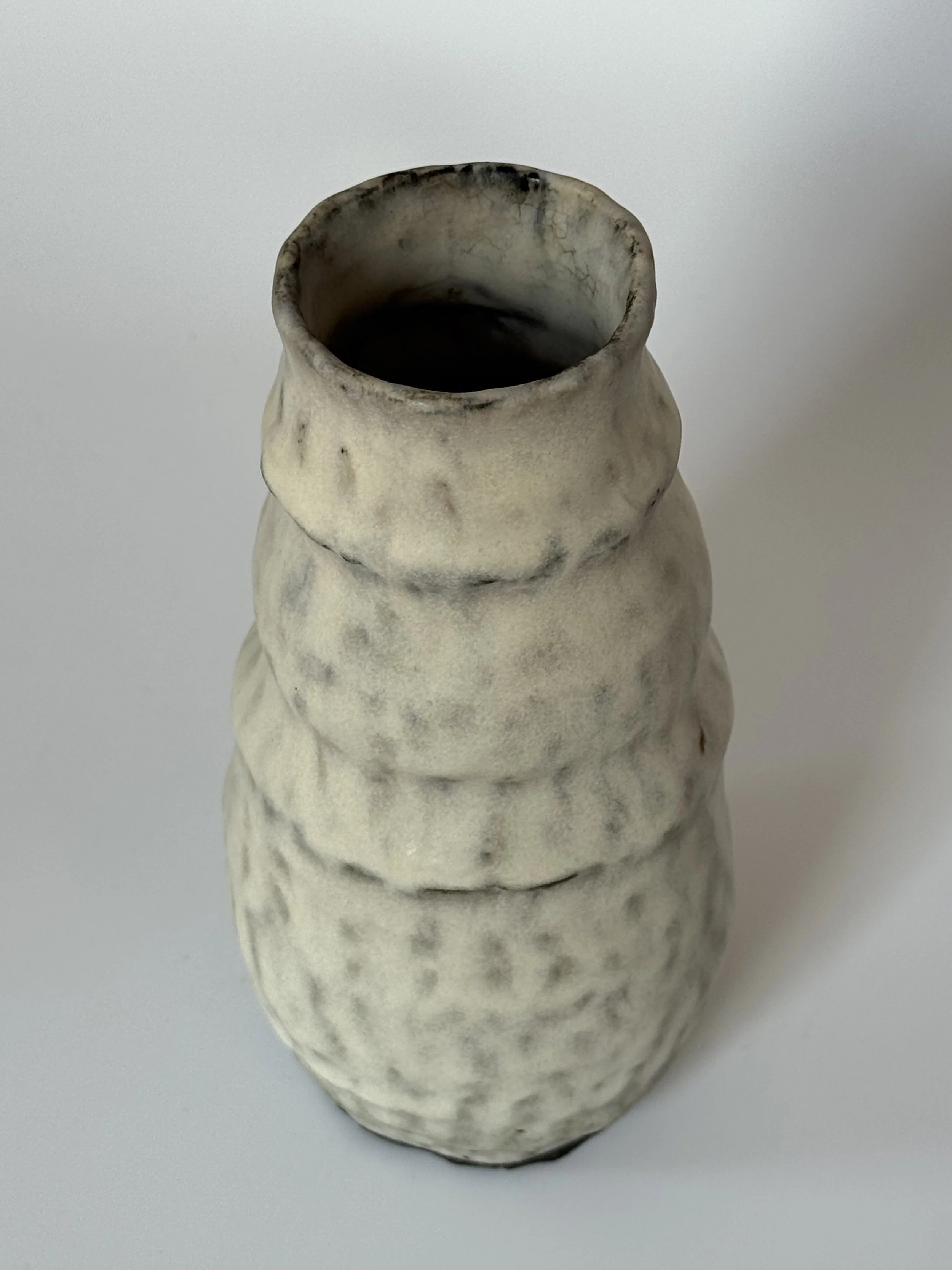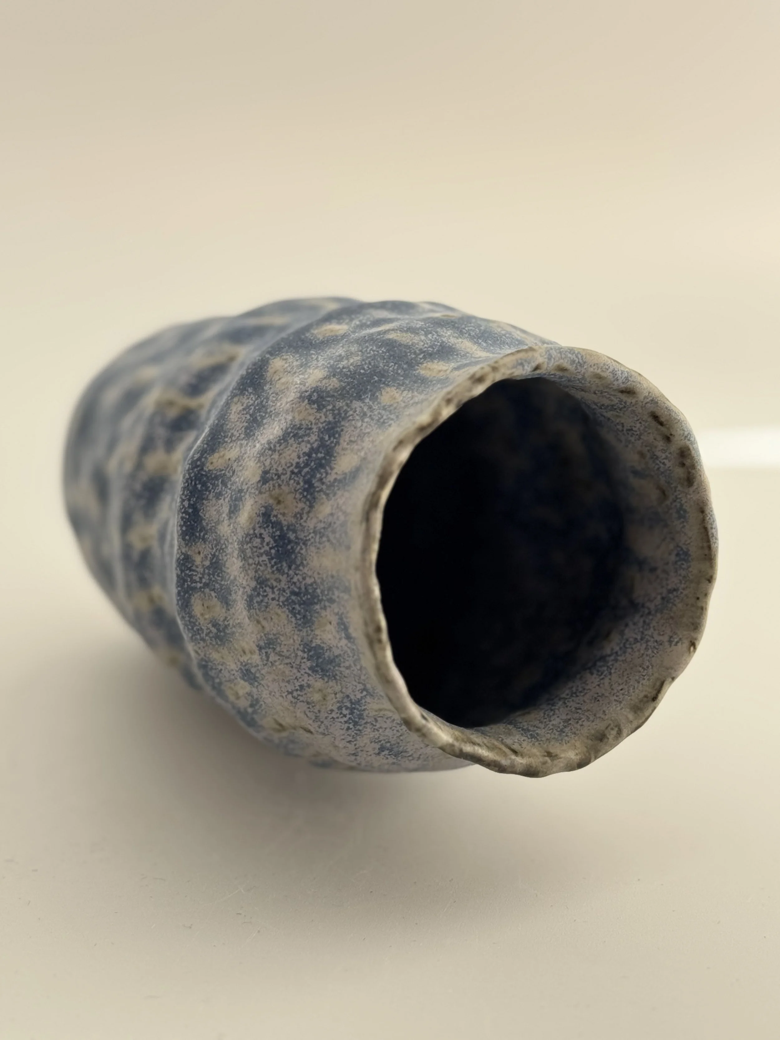 Black slip (clay and pigment) is painted on to raw clay and then pinched into shape, creating varied glaze reactions.