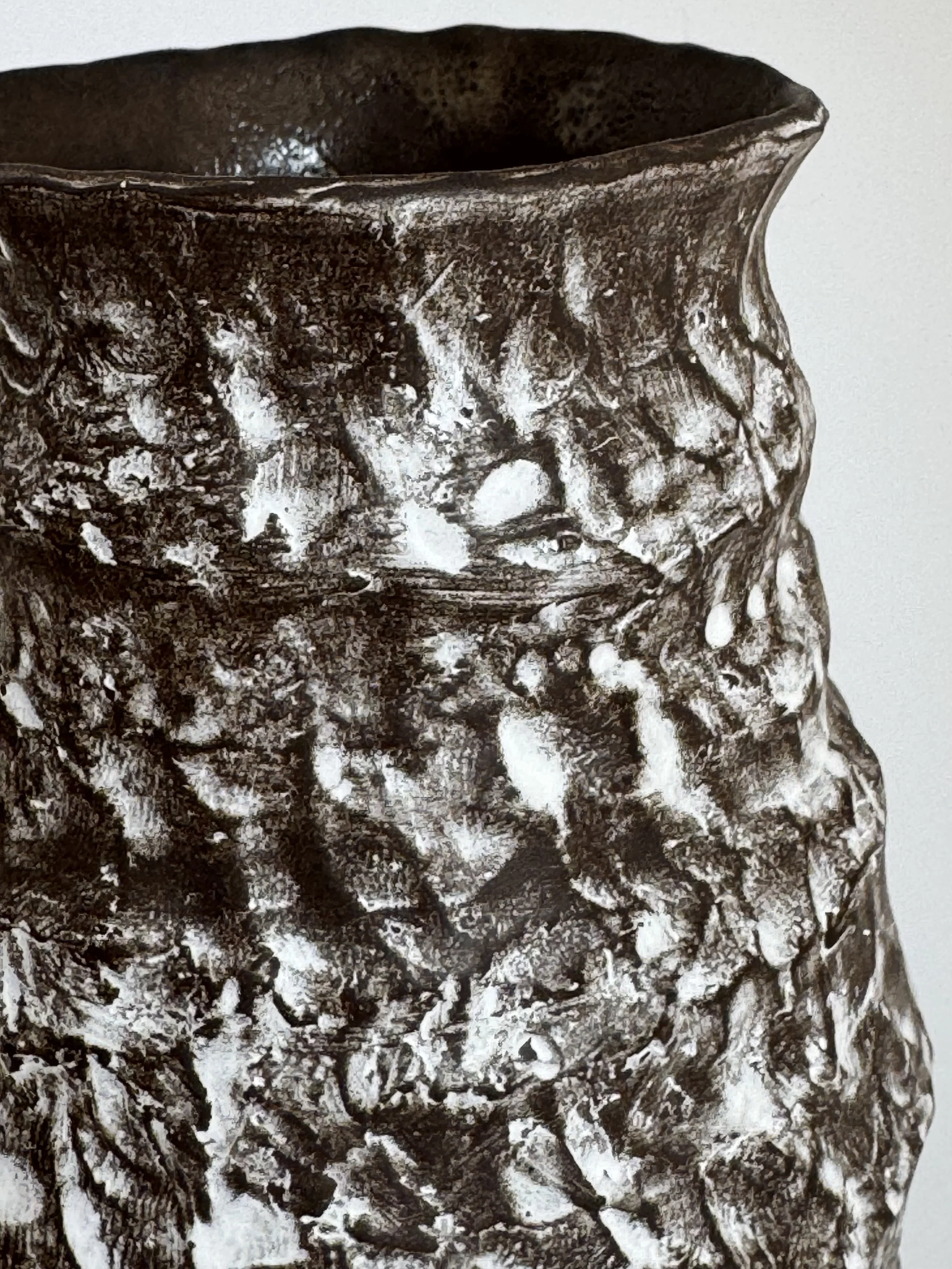 Dark brown clay formed into a classic shape. Hand painted in terra sigillata with a light touch for contrast and to expose the beauty of the raw clay body. The interior is glazed in matching matte chocolate brown so as not to distract.