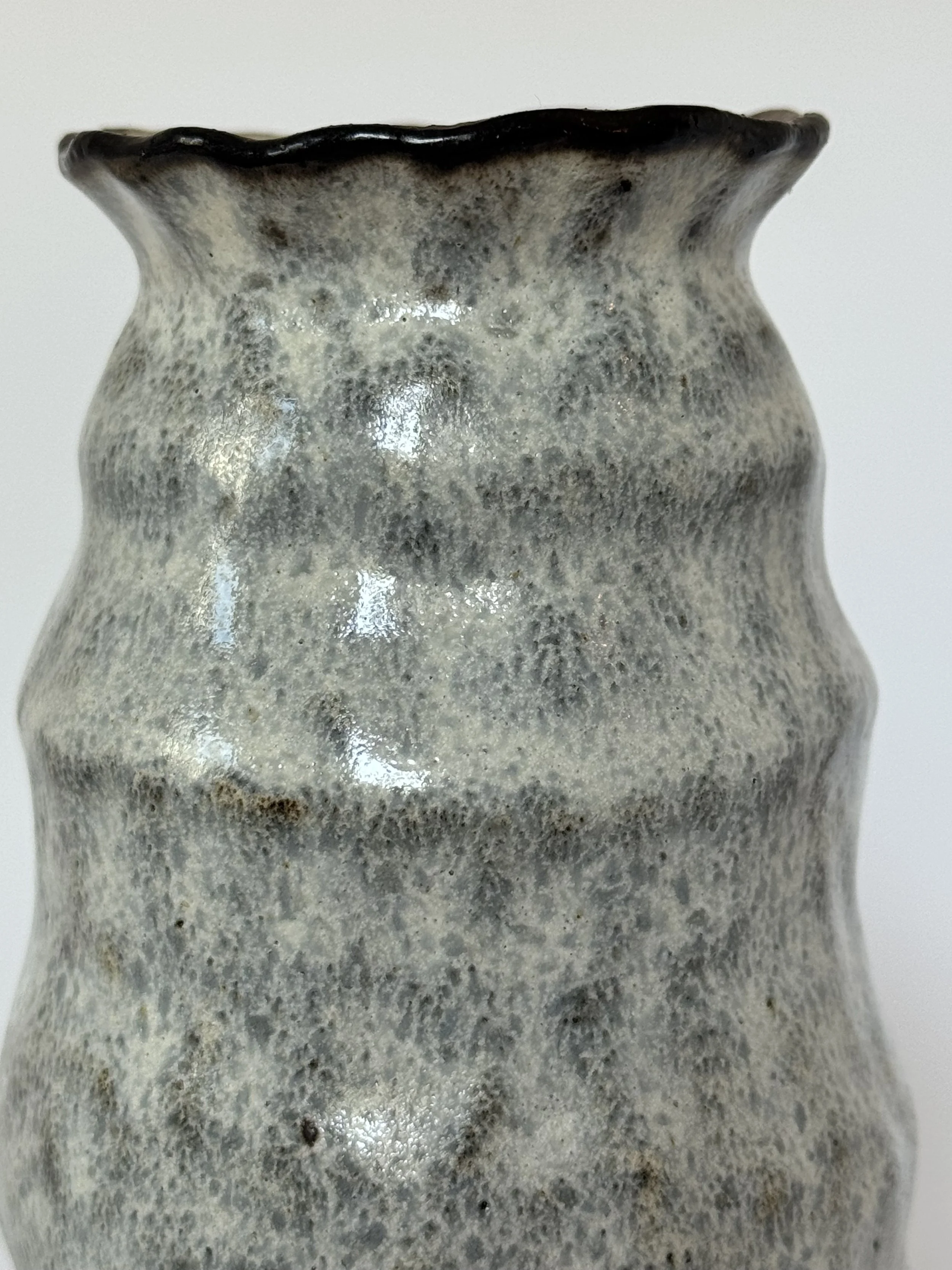 An elevated vessel with a fluted lip. Black slip is painted over red clay and washed in a translucent white glaze. The rim and foot are accented with iron wash.