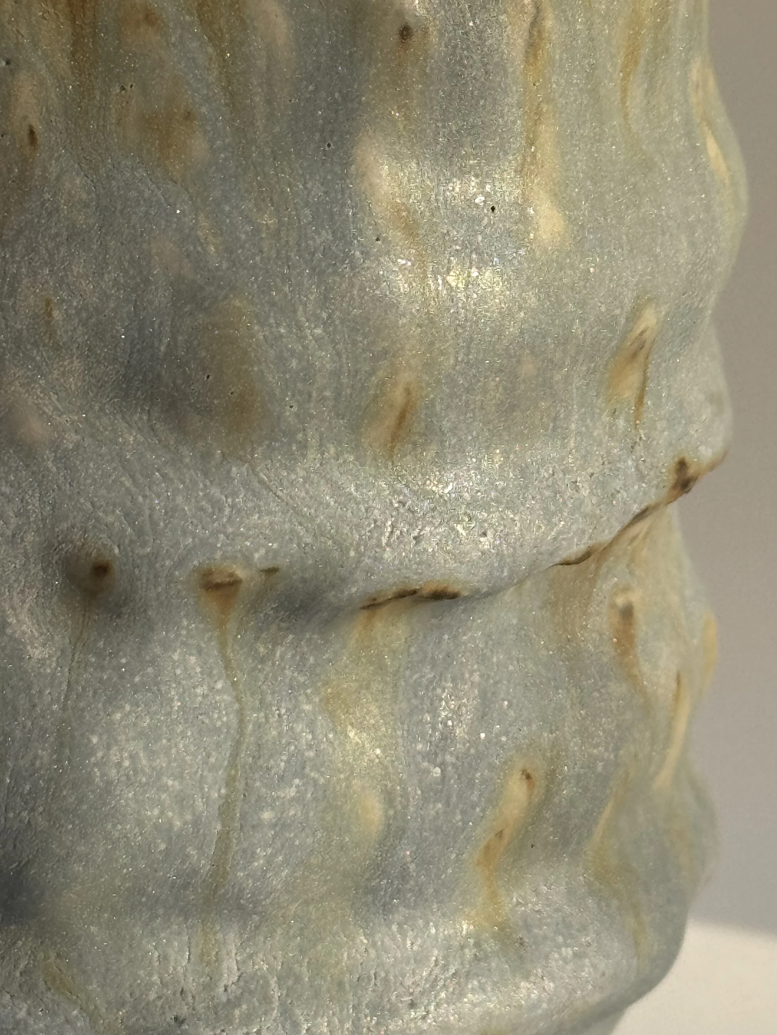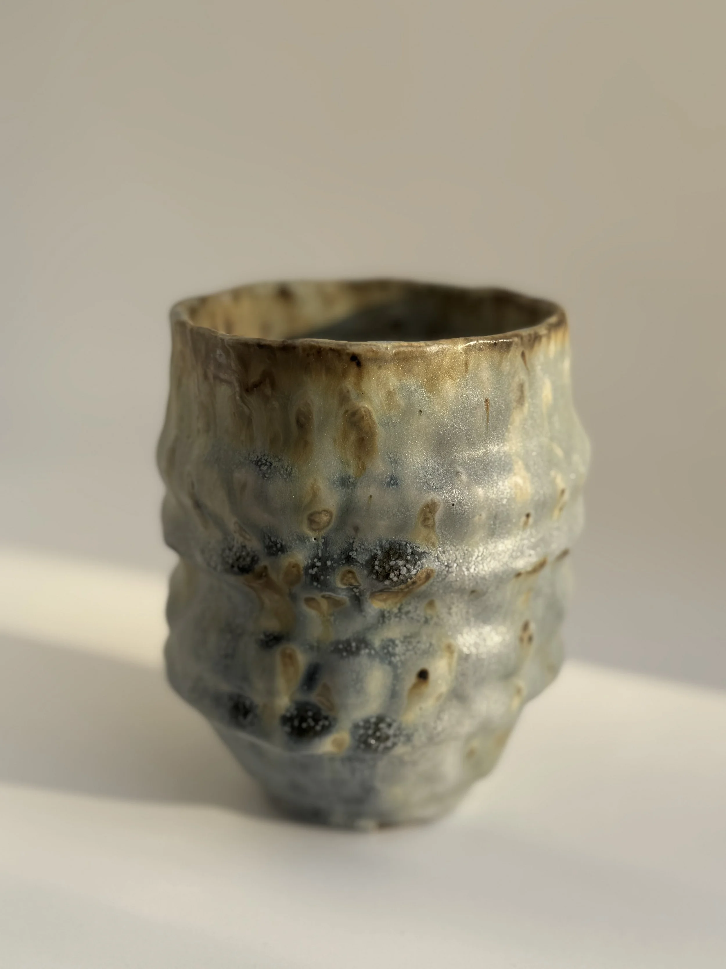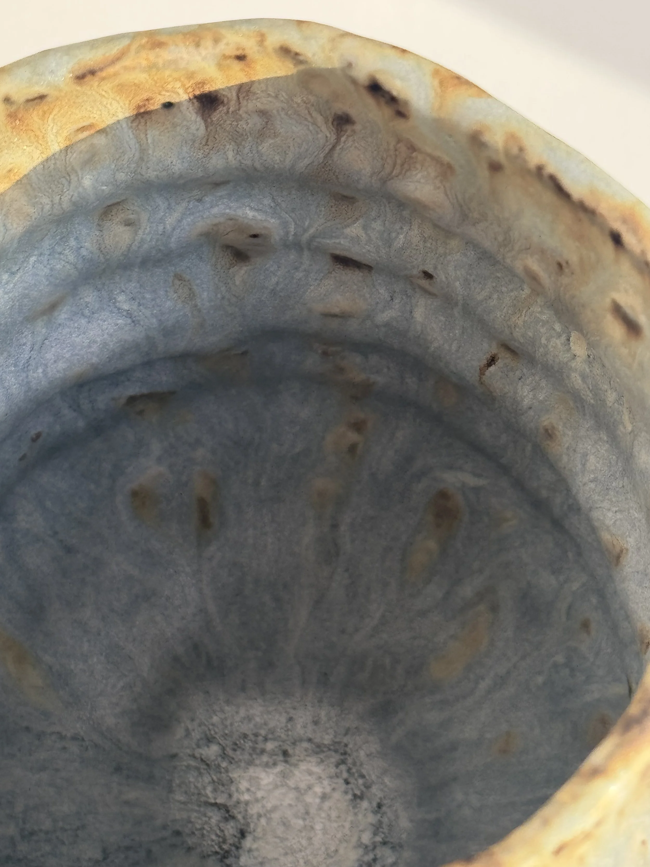 A toasty, marbled thistle surface on an undulating open cup form. Deep blue crystal pools where glaze gathered.